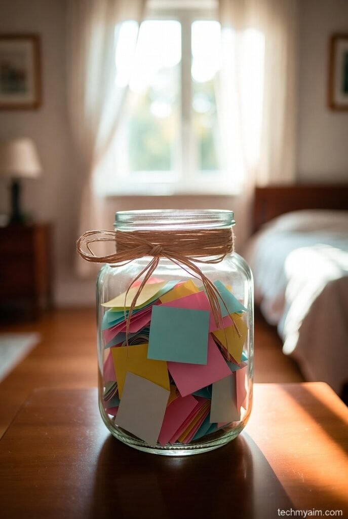 Write small notes like reasons you appreciate him, fun memories, or kind messages. Fold them and place them inside the jar.