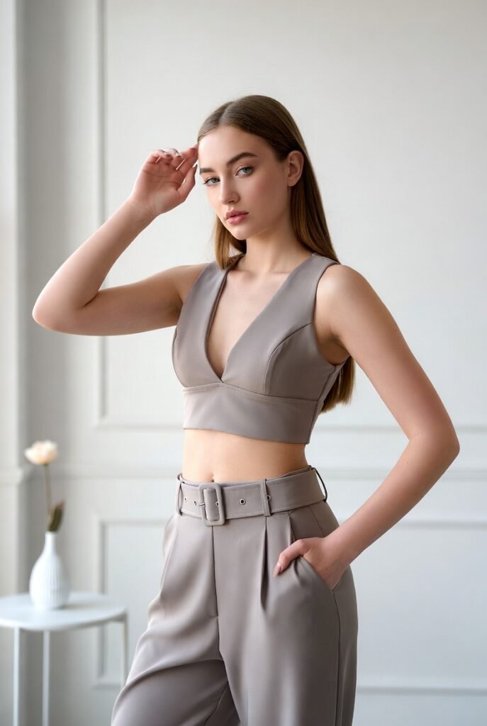 High-waisted pants paired with a cute crop top create a trendy and flattering silhouette. This outfit works great in spring and summer and can be layered with a jacket when it gets cooler.