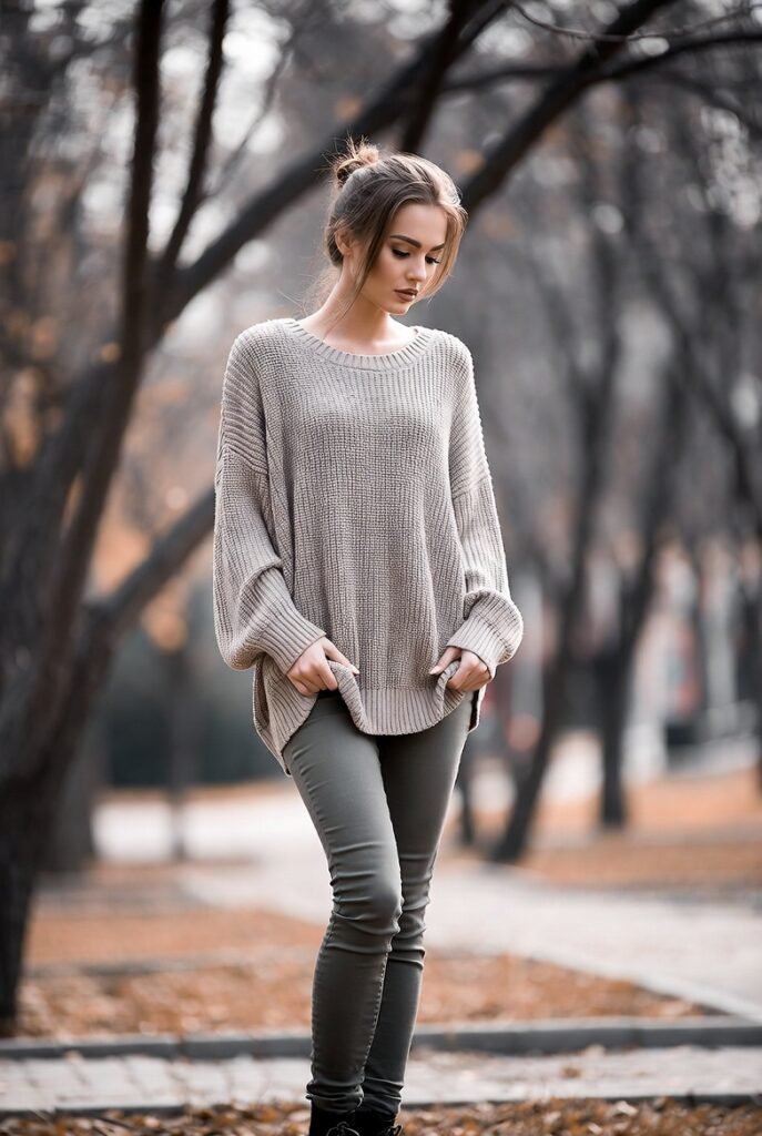 For fall and winter, pair an oversized sweater with skinny jeans or leggings. This combination is warm, comfortable, and stylish. Complete the look with ankle boots and a scarf.