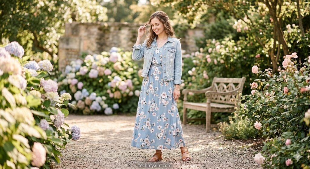 A flowy maxi dress is soft and feminine. When you add a denim jacket, it creates a balanced look that is both casual and stylish.