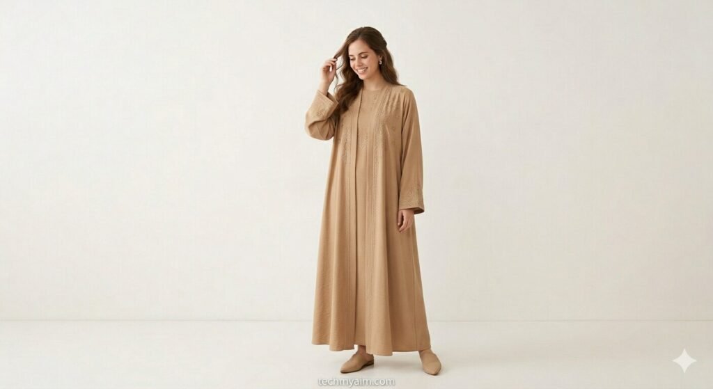 An abaya is a traditional modest outfit that looks very graceful. Modern designs include simple embroidery and soft colors.
