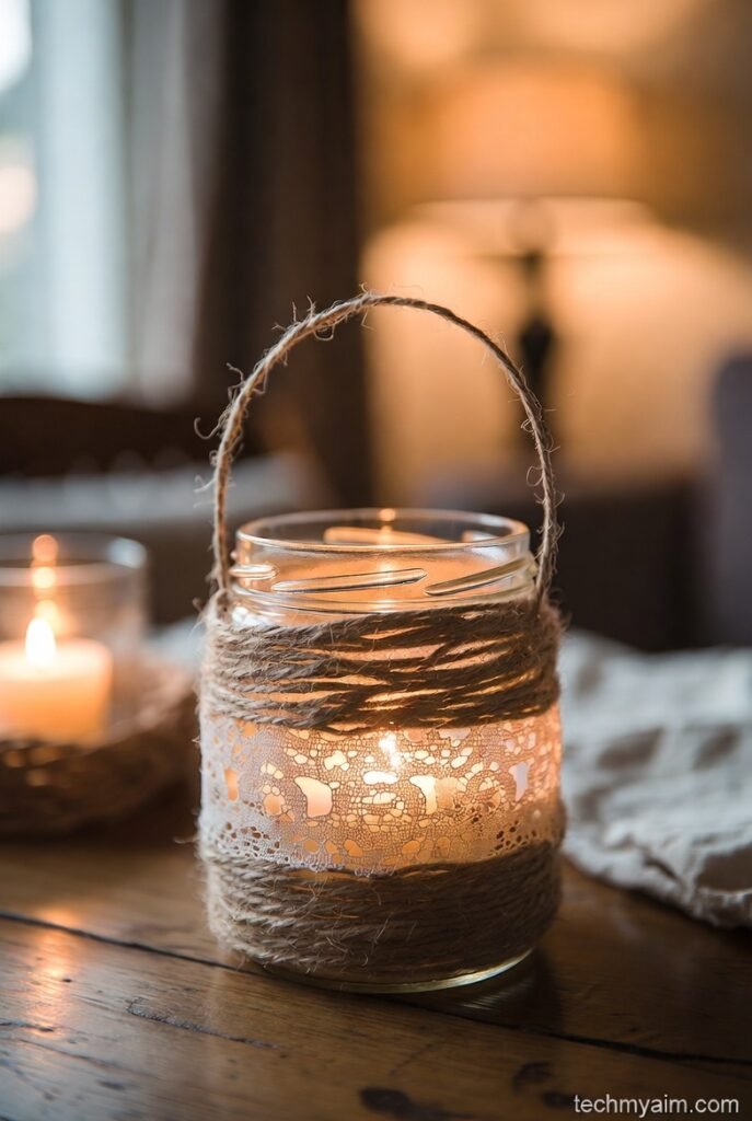 Transform a simple glass jar into a beautiful candle holder. Wrap the jar with twine, lace, or decorative tape and place a small candle inside.
