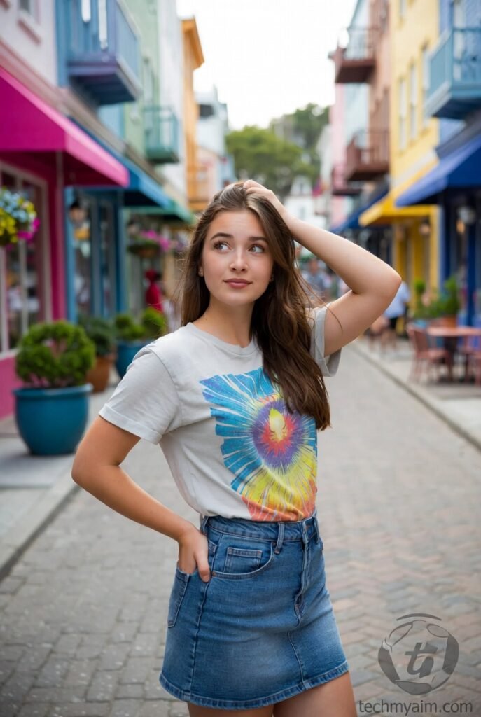 A graphic t-shirt paired with a denim skirt is a fun and youthful spring break outfit. Add sneakers or sandals to complete the casual look.