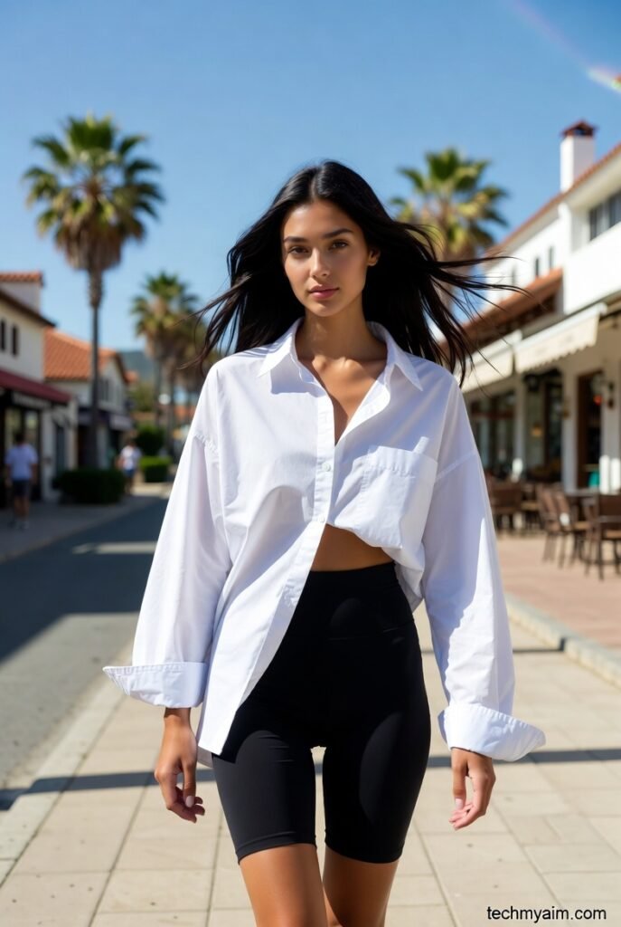 This outfit is perfect for travel days or casual sightseeing. An oversized shirt paired with biker shorts creates a comfortable yet trendy look.