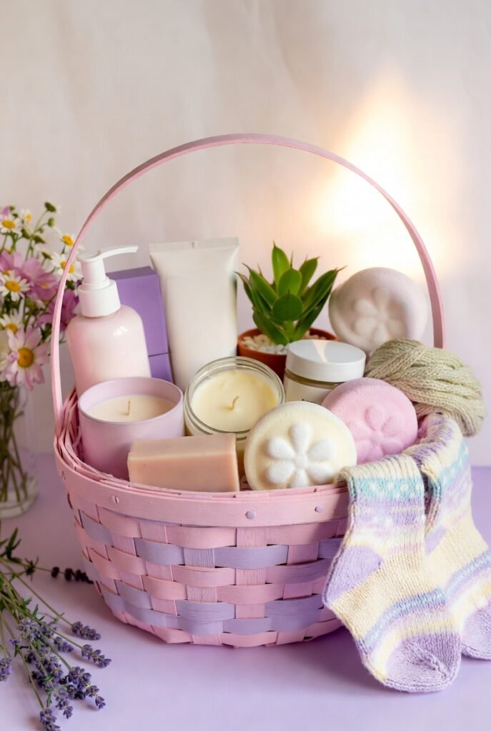 Help them relax and recharge with a basket filled with self-care essentials. Think face masks, scented candles, bath bombs, skincare products, and cozy socks. You can even include a journal or mindfulness cards for a mental wellness boost.