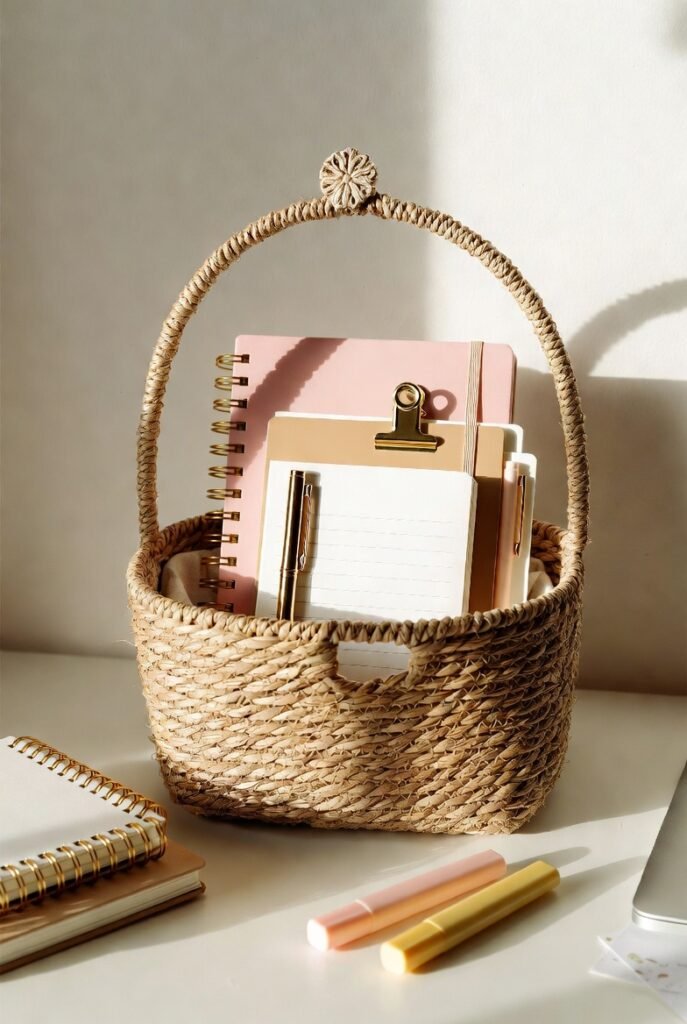 Perfect for students, this basket can include aesthetic stationery, planners, highlighters, sticky notes, and motivational items. Add a nice water bottle or desk décor to keep them inspired.