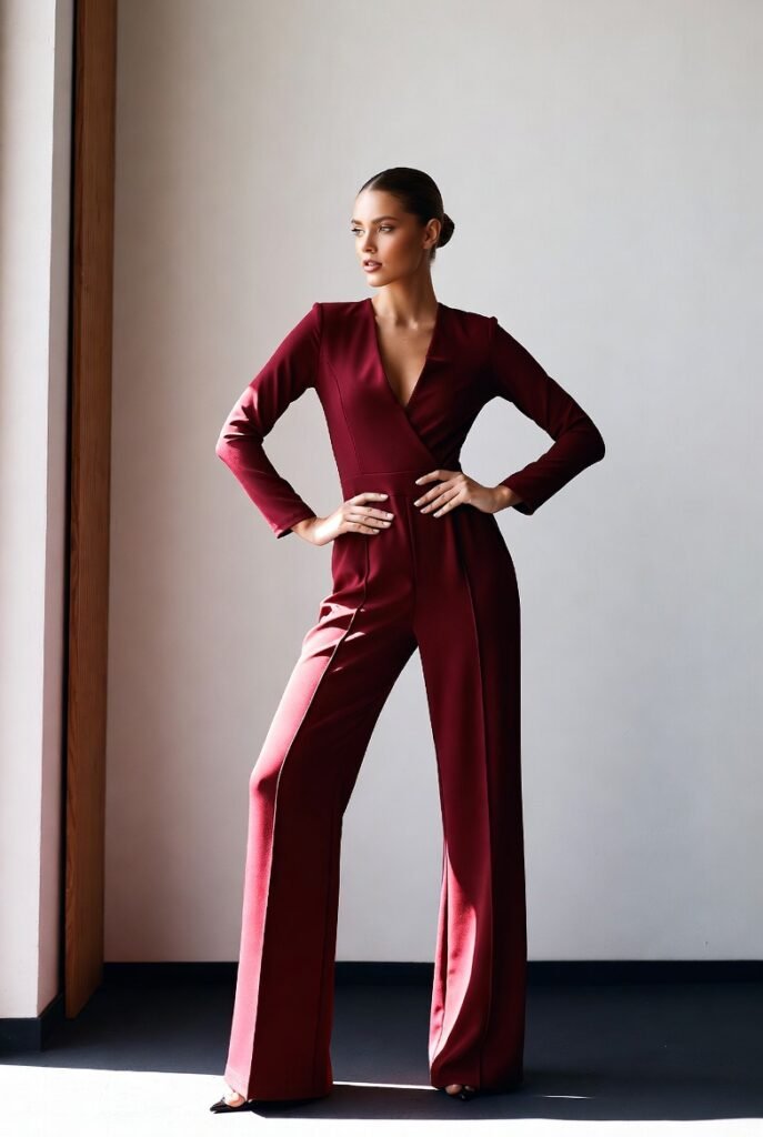 If dresses aren’t your thing, go for a tailored jumpsuit. It’s modern, flattering, and super comfortable. Choose one in deep shades like burgundy, emerald, or classic black for a polished look.