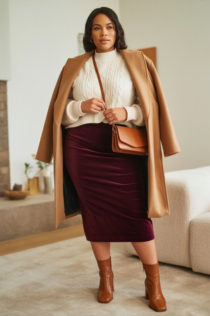 Perfect for those looking for plus size ideas big stomach styling without compromising on polish. The structured skirt smooths over curves beautifully, while the cozy sweater offers balance. Try this for business casual settings, family photos, or just when you want to feel like a fall queen.